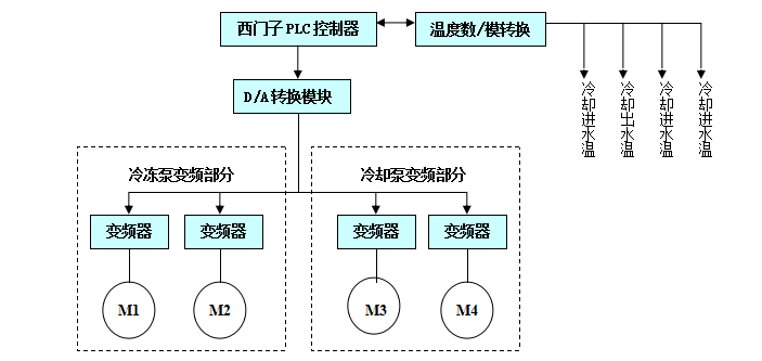 中央空調(diào)系統(tǒng)中冷凍主機(jī)可以根據(jù)負(fù)載變化隨之加載或減載,冷凍水泵和冷卻水泵卻不能隨負(fù)載變化作出相應(yīng)的調(diào)節(jié)。這樣,冷凍水、冷卻水系統(tǒng)幾乎長(zhǎng)期在大流量、小溫差的狀態(tài)下運(yùn)行,造成了能量的極大浪費(fèi)。為了解決以上問(wèn)題,我們可以利用變頻器、松下PLC 、數(shù)模轉(zhuǎn)換模塊、溫度模塊、溫度傳感器等構(gòu)成的溫差閉環(huán)自動(dòng)調(diào)速系統(tǒng)。對(duì)冷凍、冷卻水泵、冷卻塔進(jìn)行改造,以節(jié)約電能。