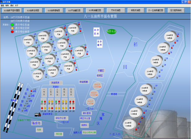 本畫面主要是對(duì)油庫(kù)整個(gè)系統(tǒng)的平面監(jiān)視圖,對(duì)各個(gè)油罐及發(fā)油臺(tái)的狀態(tài)的顯示。